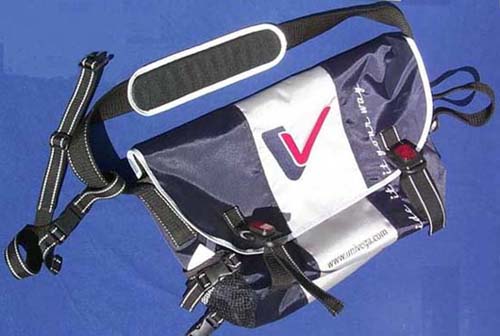 custom messenger bag with reflective trimming all around, plus blinking LED buckles.